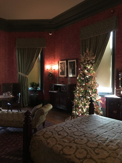 Let's take a peek into some of the most iconic spaces of the house. The first room on the tour is the Winter Garden. The octagonal room features a large glass roof to allow massive amounts of sunlight to reach the indoor garden no matter what season it is. At one time, parts of the roof did open to allow a cool breeze in during times of entertainment or relaxing. As you can see in the photos, poinsettias and lights have been placed all around the room to bring in the spirit of Christmas. Located in the center of the space, the fountain acted as a point for all the rooms on the first floor to radiate off of.